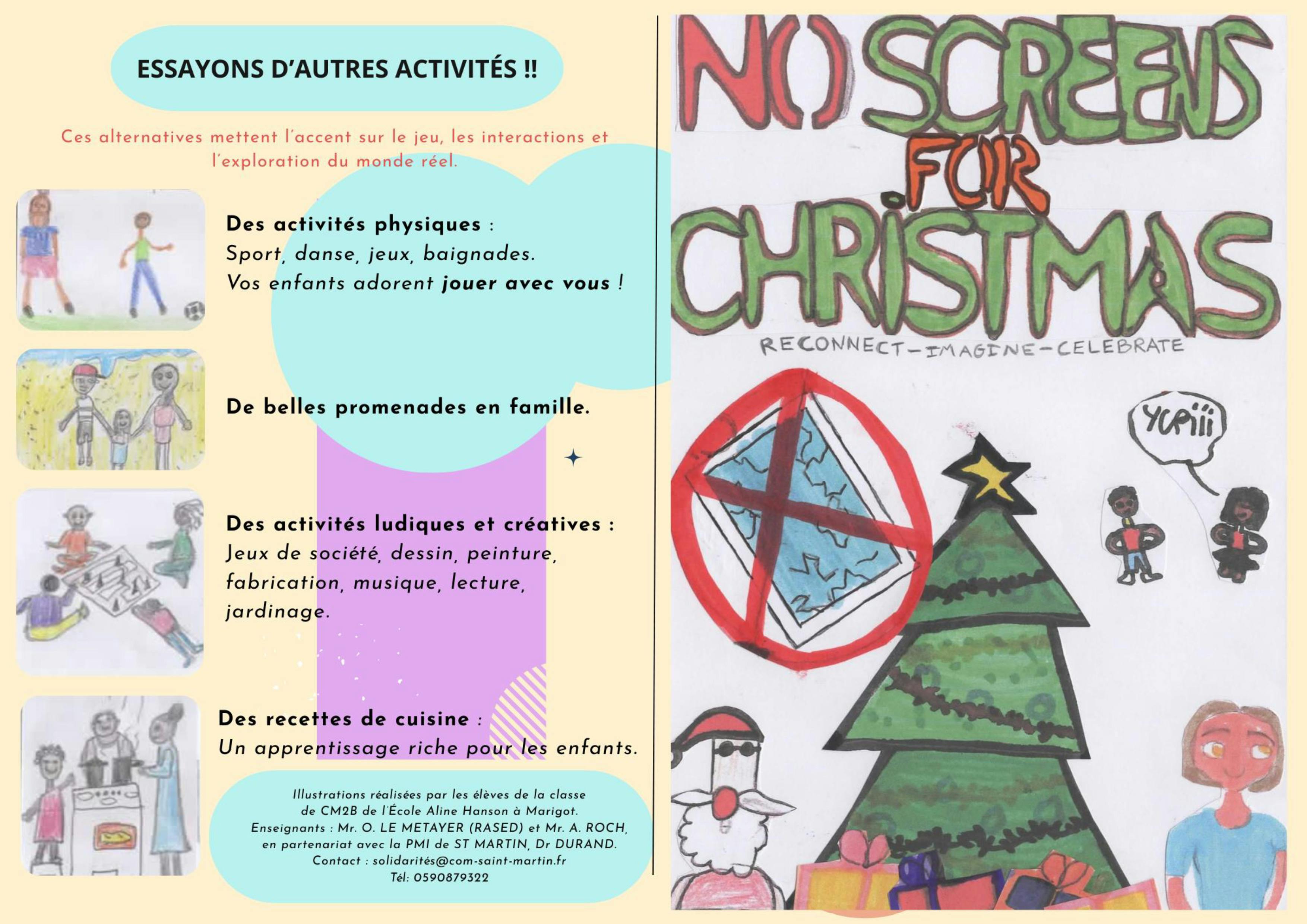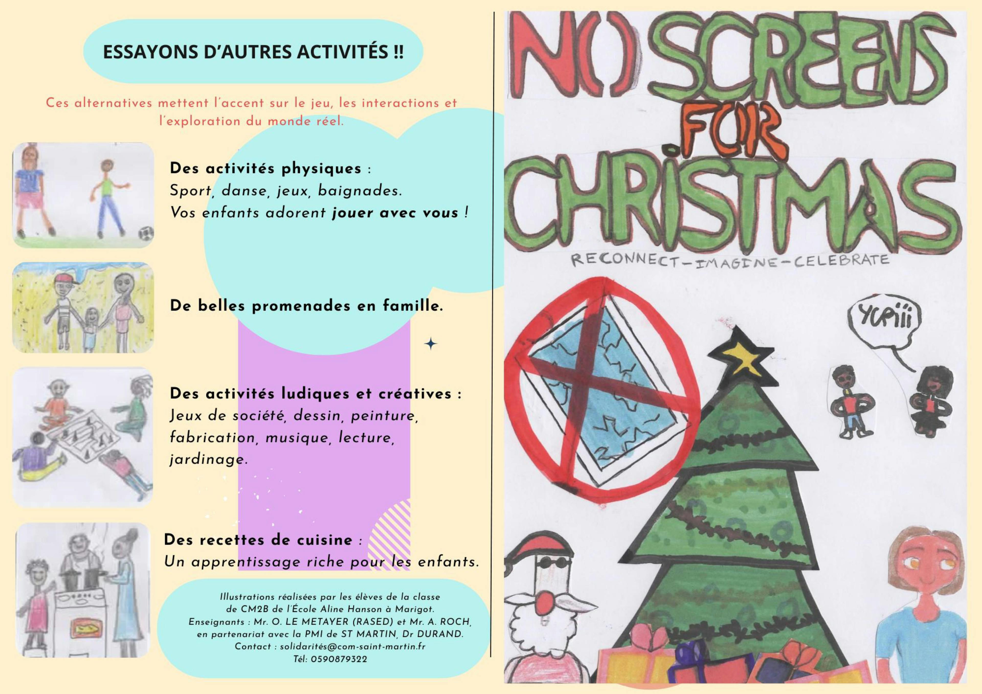 En partenariat avec Mr LEMETAYER, enseignant en école primaire, un flyer a été préparé pour les jeunes enfants dans les trois langues les plus parlées à Saint-Martin, intitulé NO SCRENN FOR CHRISTMAS. (Ci-joint).